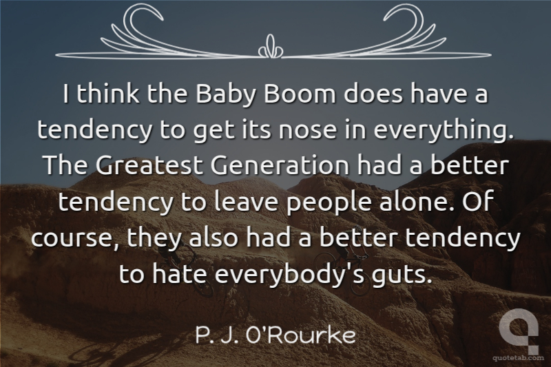 I think the Baby Boom does have a tendency to get its nose in everything. The Greatest Generation had a better tendency to leave people alone. Of course, they also had a better tendency to hate everybody's guts.