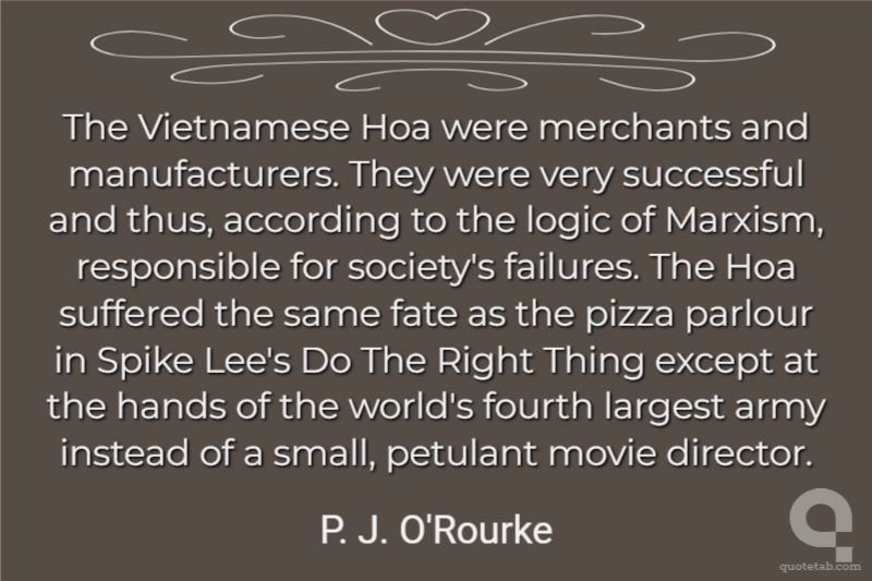 The Vietnamese Hoa were merchants and manufacturers. They were very successful and thus, according to the logic of Marxism, responsible for society's failures. The Hoa suffered the same fate as the pizza parlour in Spike Lee's Do The Right Thing except at the hands of the world's fourth largest army instead of a small, petulant movie director.