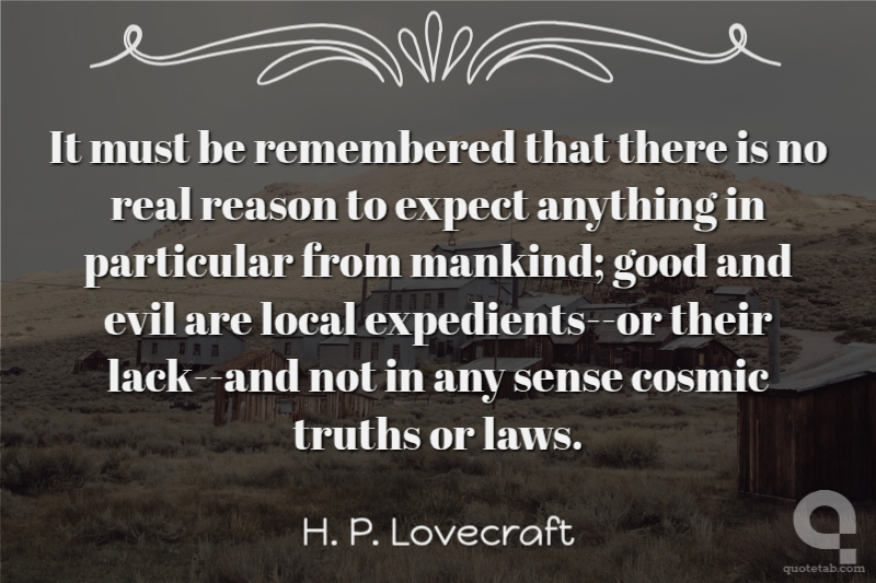It must be remembered that there is no real reason to expect anything in particular from mankind; good and evil are local expedients--or their lack--and not in any sense cosmic truths or laws.