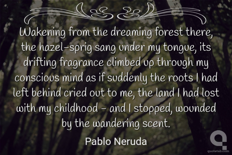 Wakening from the dreaming forest there, the hazel-sprig sang under my tongue, its drifting fragrance climbed up through my conscious mind as if suddenly the roots I had left behind cried out to me, the land I had lost with my childhood - and I stopped, wounded by the wandering scent.
