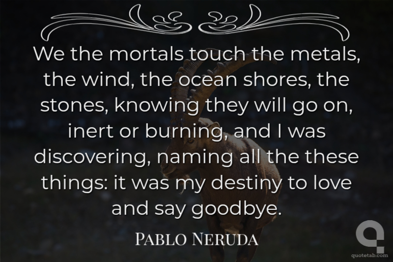 We the mortals touch the metals, the wind, the ocean shores, the stones, knowing they will go on, inert or burning, and I was discovering, naming all the these things: it was my destiny to love and say goodbye.