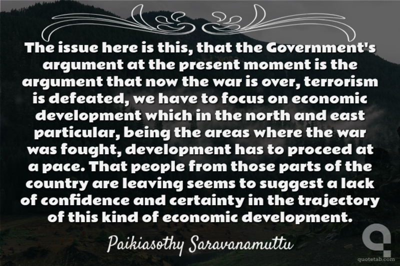 The issue here is this, that the Government's argument at the present moment is the argument that now the war is over, terrorism is defeated, we have to focus on economic development which in the north and east particular, being the areas where the war was fought, development has to proceed at a pace. That people from those parts of the country are leaving seems to suggest a lack of confidence and certainty in the trajectory of this kind of economic development.