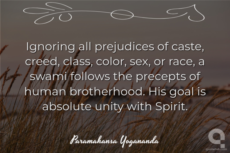 Ignoring all prejudices of caste, creed, class, color, sex, or race, a swami follows the precepts of human brotherhood. His goal is absolute unity with Spirit.