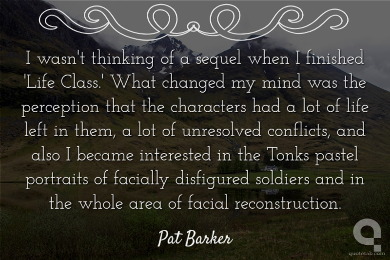 I wasn't thinking of a sequel when I finished 'Life Class.' What changed my mind was the perception that the characters had a lot of life left in them, a lot of unresolved conflicts, and also I became interested in the Tonks pastel portraits of facially disfigured soldiers and in the whole area of facial reconstruction.