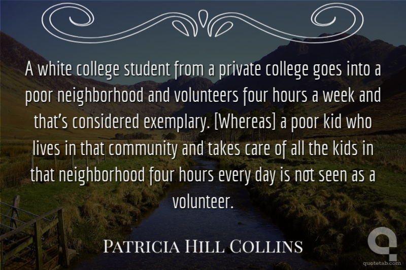A white college student from a private college goes into a poor neighborhood and volunteers four hours a week and that's considered exemplary. [Whereas] a poor kid who lives in that community and takes care of all the kids in that neighborhood four hours every day is not seen as a volunteer.