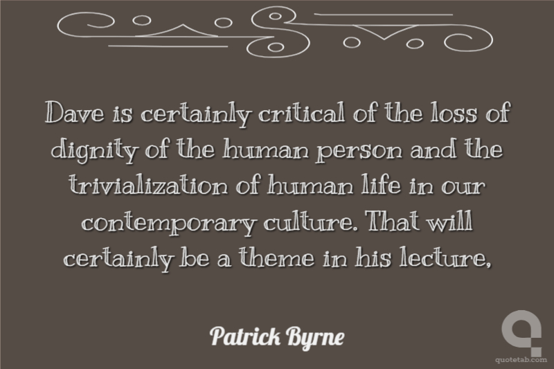 Dave is certainly critical of the loss of dignity of the human person and the trivialization of human life in our contemporary culture. That will certainly be a theme in his lecture,