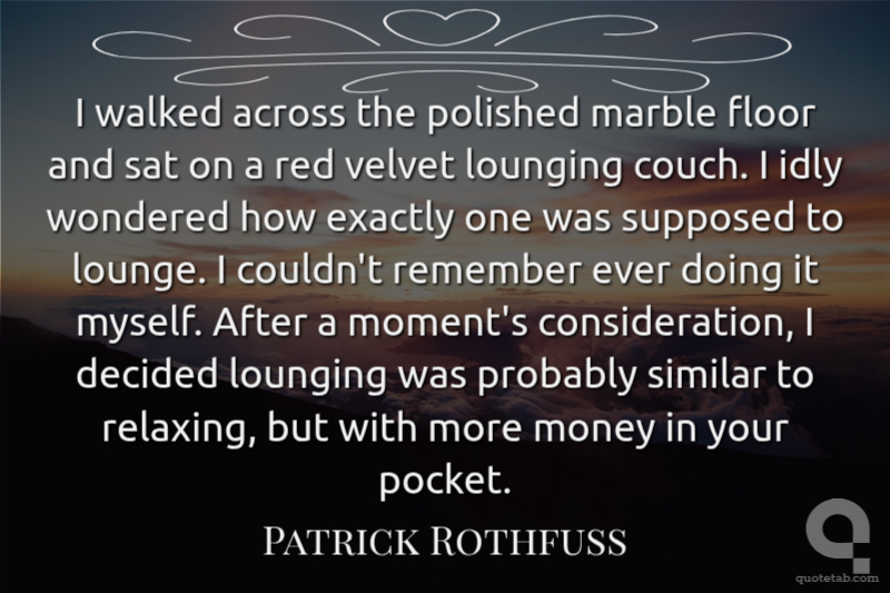 I walked across the polished marble floor and sat on a red velvet lounging couch. I idly wondered how exactly one was supposed to lounge. I couldn't remember ever doing it myself. After a moment's consideration, I decided lounging was probably similar to relaxing, but with more money in your pocket.