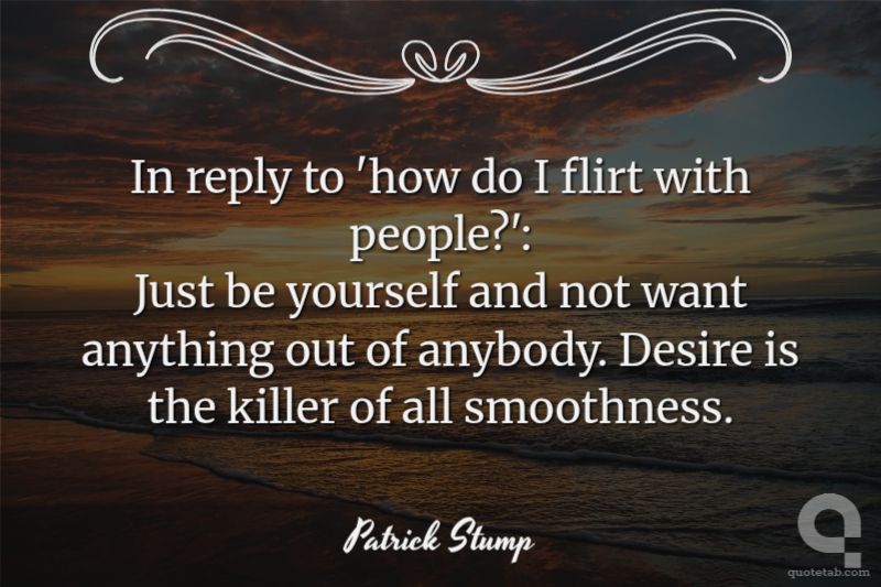 In reply to 'how do I flirt with people?': Just be yourself and not want anything out of anybody. Desire is the killer of all smoothness.