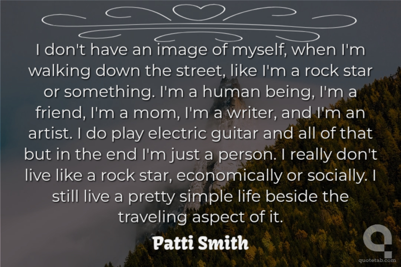 I don't have an image of myself, when I'm walking down the street, like I'm a rock star or something. I'm a human being, I'm a friend, I'm a mom, I'm a writer, and I'm an artist. I do play electric guitar and all of that but in the end I'm just a person. I really don't live like a rock star, economically or socially. I still live a pretty simple life beside the traveling aspect of it.