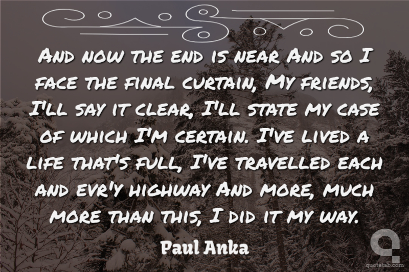 And now the end is near And so I face the final curtain, My friends, I'll say it clear, I'll state my case of which I'm certain. I've lived a life that's full, I've travelled each and evr'y highway And more, much more than this, I did it my way.
