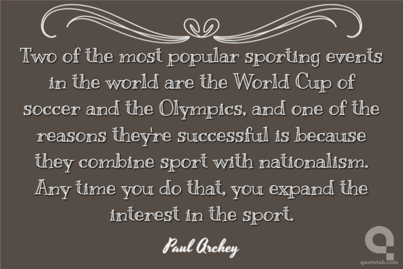 Two of the most popular sporting events in the world are the World Cup of soccer and the Olympics, and one of the reasons they're successful is because they combine sport with nationalism. Any time you do that, you expand the interest in the sport.