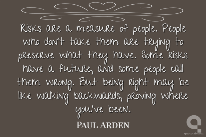 Risks are a measure of people. People who don't take them are trying to preserve what they have. Some risks have a future, and some people call them wrong. But being right may be like walking backwards, proving where you've been.