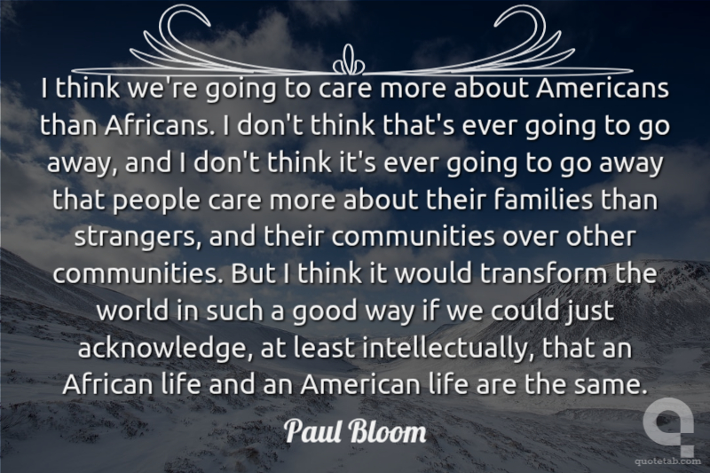 I think we're going to care more about Americans than Africans. I don't think that's ever going to go away, and I don't think it's ever going to go away that people care more about their families than strangers, and their communities over other communities. But I think it would transform the world in such a good way if we could just acknowledge, at least intellectually, that an African life and an American life are the same.
