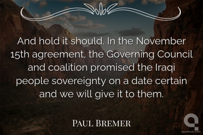 And hold it should. In the November 15th agreement, the Governing Council and coalition promised the Iraqi people sovereignty on a date certain and we will give it to them.