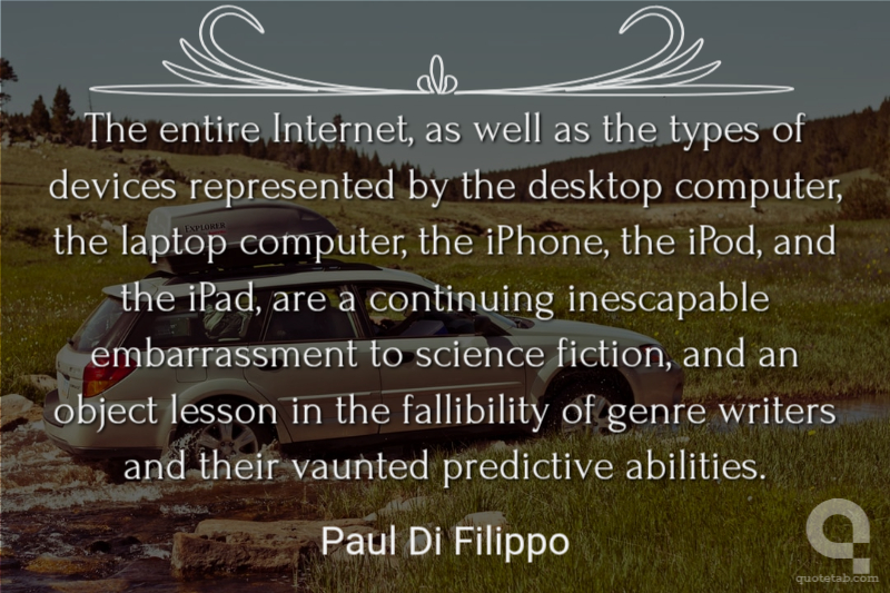 The entire Internet, as well as the types of devices represented by the desktop computer, the laptop computer, the iPhone, the iPod, and the iPad, are a continuing inescapable embarrassment to science fiction, and an object lesson in the fallibility of genre writers and their vaunted predictive abilities.