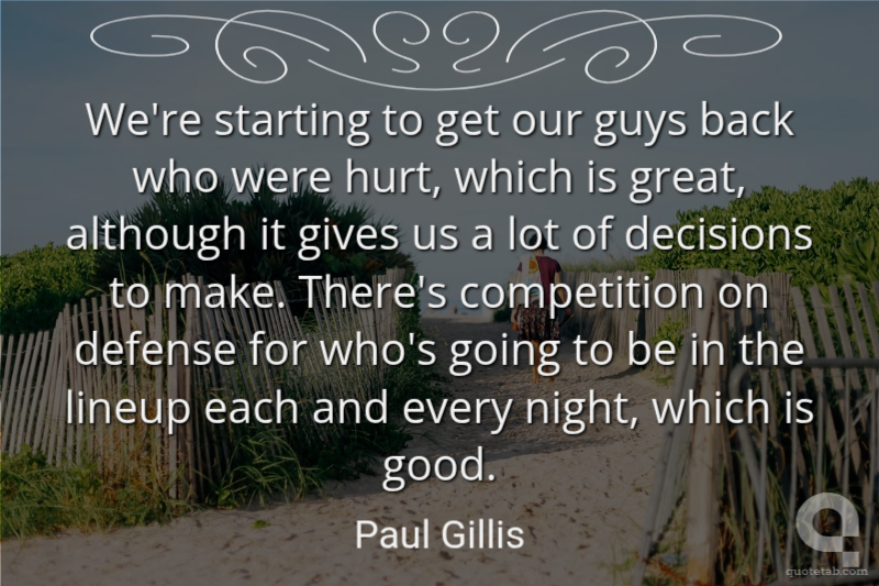 We're starting to get our guys back who were hurt, which is great, although it gives us a lot of decisions to make. There's competition on defense for who's going to be in the lineup each and every night, which is good.