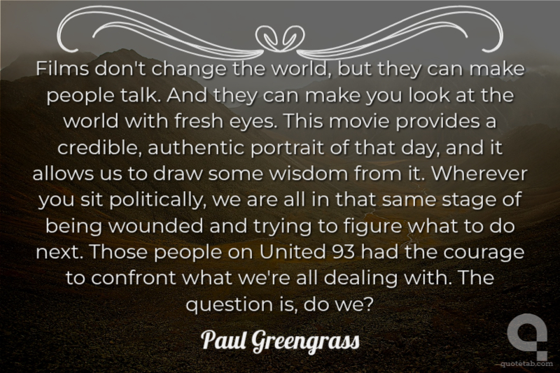 Films don't change the world, but they can make people talk. And they can make you look at the world with fresh eyes. This movie provides a credible, authentic portrait of that day, and it allows us to draw some wisdom from it. Wherever you sit politically, we are all in that same stage of being wounded and trying to figure what to do next. Those people on United 93 had the courage to confront what we're all dealing with. The question is, do we?