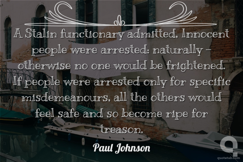 A Stalin functionary admitted, Innocent people were arrested: naturally - otherwise no one would be frightened. If people were arrested only for specific misdemeanours, all the others would feel safe and so become ripe for treason.