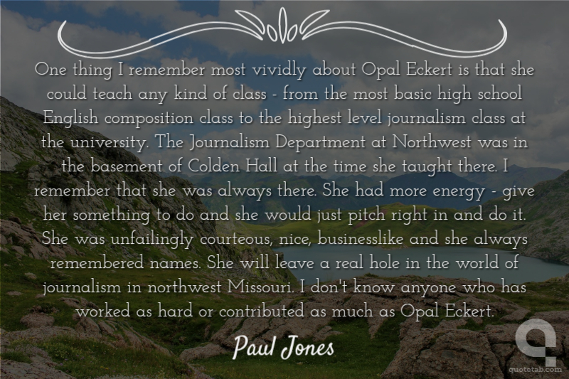 One thing I remember most vividly about Opal Eckert is that she could teach any kind of class - from the most basic high school English composition class to the highest level journalism class at the university. The Journalism Department at Northwest was in the basement of Colden Hall at the time she taught there. I remember that she was always there. She had more energy - give her something to do and she would just pitch right in and do it. She was unfailingly courteous, nice, businesslike and she always remembered names. She will leave a real hole in the world of journalism in northwest Missouri. I don't know anyone who has worked as hard or contributed as much as Opal Eckert.