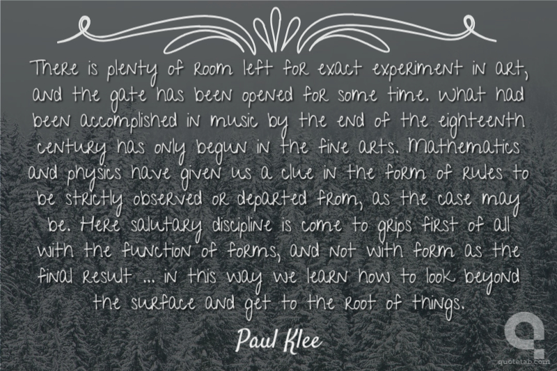 There is plenty of room left for exact experiment in art, and the gate has been opened for some time. What had been accomplished in music by the end of the eighteenth century has only begun in the fine arts. Mathematics and physics have given us a clue in the form of rules to be strictly observed or departed from, as the case may be. Here salutary discipline is come to grips first of all with the function of forms, and not with form as the final result … in this way we learn how to look beyond the surface and get to the root of things.