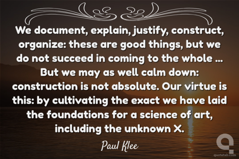 We document, explain, justify, construct, organize: these are good things, but we do not succeed in coming to the whole ... But we may as well calm down: construction is not absolute. Our virtue is this: by cultivating the exact we have laid the foundations for a science of art, including the unknown X.