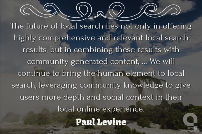 The future of local search lies not only in offering highly comprehensive and relevant local search results, but in combining these results with community generated content, ... We will continue to bring the human element to local search, leveraging community knowledge to give users more depth and social context in their local online experience.