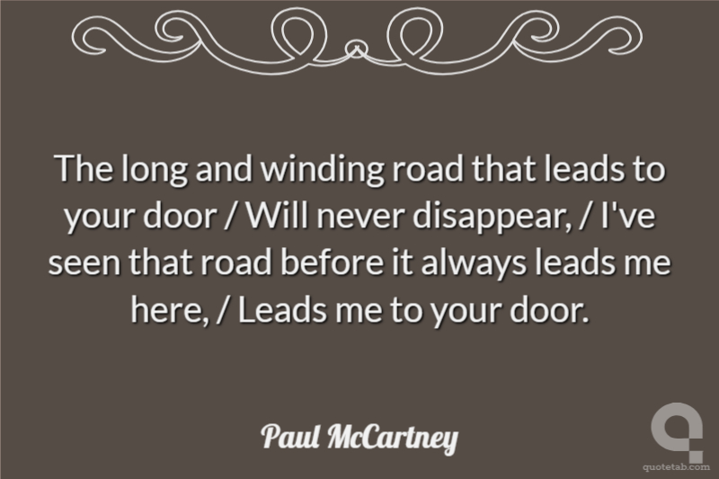 The long and winding road that leads to your door / Will never disappear, / I've seen that road before it always leads me here, / Leads me to your door.