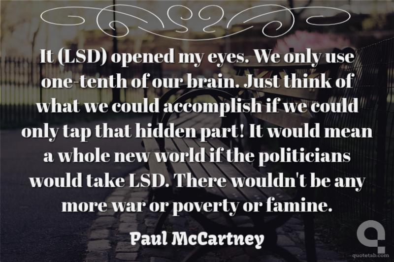 It (LSD) opened my eyes. We only use one-tenth of our brain. Just think of what we could accomplish if we could only tap that hidden part! It would mean a whole new world if the politicians would take LSD. There wouldn't be any more war or poverty or famine.