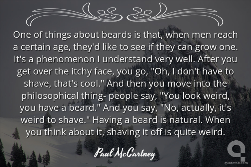 One of things about beards is that, when men reach a certain age, they'd like to see if they can grow one. It's a phenomenon I understand very well. After you get over the itchy face, you go, "Oh, I don't have to shave, that's cool." And then you move into the philosophical thing- people say, "You look weird, you have a beard." And you say, "No, actually, it's weird to shave." Having a beard is natural. When you think about it, shaving it off is quite weird.