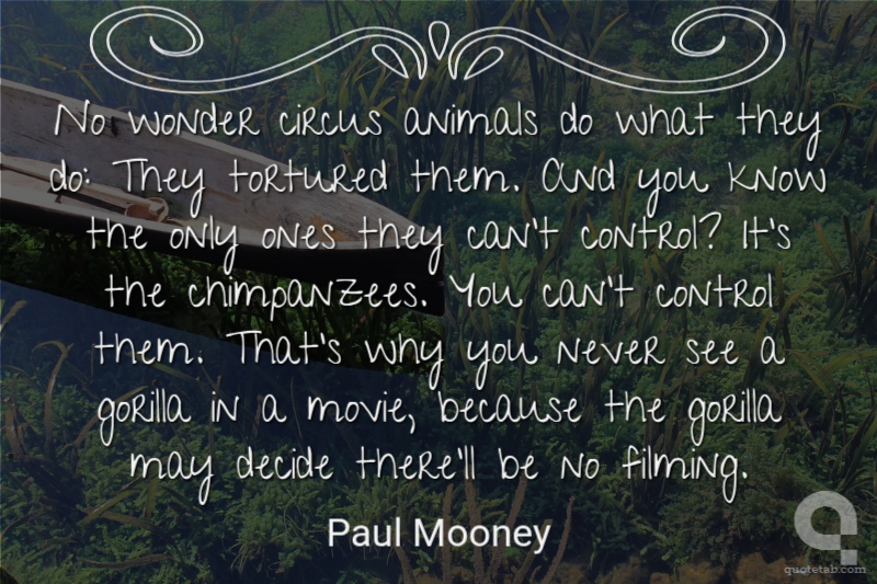 No wonder circus animals do what they do: They tortured them. And you know the only ones they can't control? It's the chimpanzees. You can't control them. That's why you never see a gorilla in a movie, because the gorilla may decide there'll be no filming.