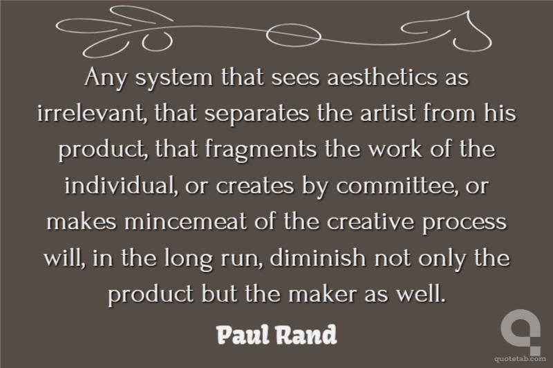 Any system that sees aesthetics as irrelevant, that separates the artist from his product, that fragments the work of the individual, or creates by committee, or makes mincemeat of the creative process will, in the long run, diminish not only the product but the maker as well.