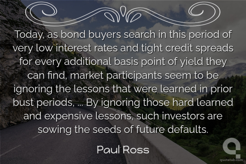 Today, as bond buyers search in this period of very low interest rates and tight credit spreads for every additional basis point of yield they can find, market participants seem to be ignoring the lessons that were learned in prior bust periods, ... By ignoring those hard learned and expensive lessons, such investors are sowing the seeds of future defaults.