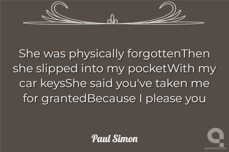 She was physically forgottenThen she slipped into my pocketWith my car keysShe said you've taken me for grantedBecause I please you