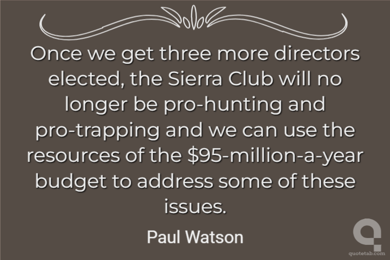 Once we get three more directors elected, the Sierra Club will no longer be pro-hunting and pro-trapping and we can use the resources of the $95-million-a-year budget to address some of these issues.