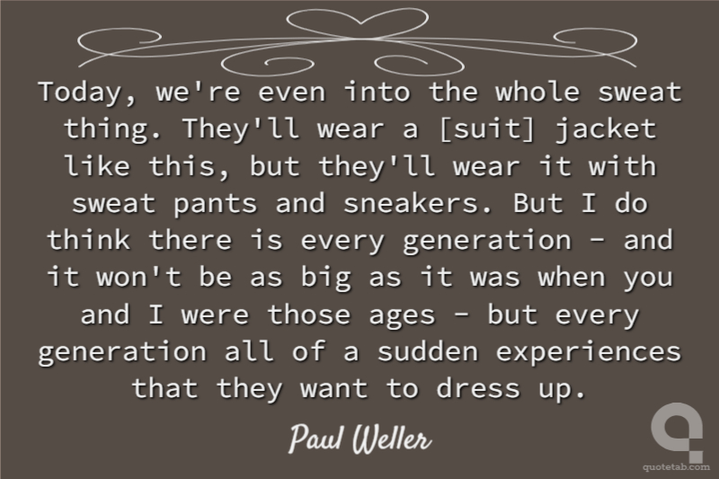 Today, we're even into the whole sweat thing. They'll wear a [suit] jacket like this, but they'll wear it with sweat pants and sneakers. But I do think there is every generation - and it won't be as big as it was when you and I were those ages - but every generation all of a sudden experiences that they want to dress up.