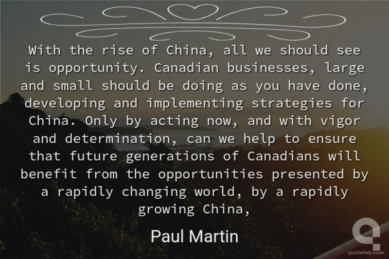 With the rise of China, all we should see is opportunity. Canadian businesses, large and small should be doing as you have done, developing and implementing strategies for China. Only by acting now, and with vigor and determination, can we help to ensure that future generations of Canadians will benefit from the opportunities presented by a rapidly changing world, by a rapidly growing China,