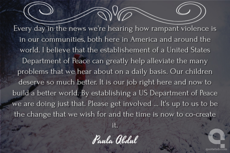 Every day in the news we're hearing how rampant violence is in our communities, both here in America and around the world. I believe that the establishement of a United States Department of Peace can greatly help alleviate the many problems that we hear about on a daily basis. Our children deserve so much better. It is our job right here and now to build a better world. By establishing a US Department of Peace we are doing just that. Please get involved ... It's up to us to be the change that we wish for and the time is now to co-create it.