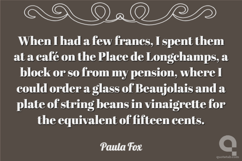 When I had a few francs, I spent them at a café on the Place de Longchamps, a block or so from my pension, where I could order a glass of Beaujolais and a plate of string beans in vinaigrette for the equivalent of fifteen cents.