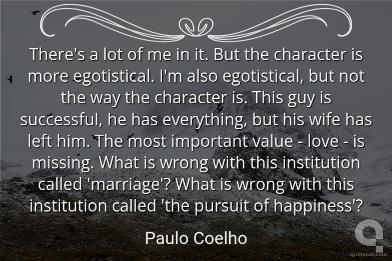 There's a lot of me in it. But the character is more egotistical. I'm also egotistical, but not the way the character is. This guy is successful, he has everything, but his wife has left him. The most important value - love - is missing. What is wrong with this institution called 'marriage'? What is wrong with this institution called 'the pursuit of happiness'?