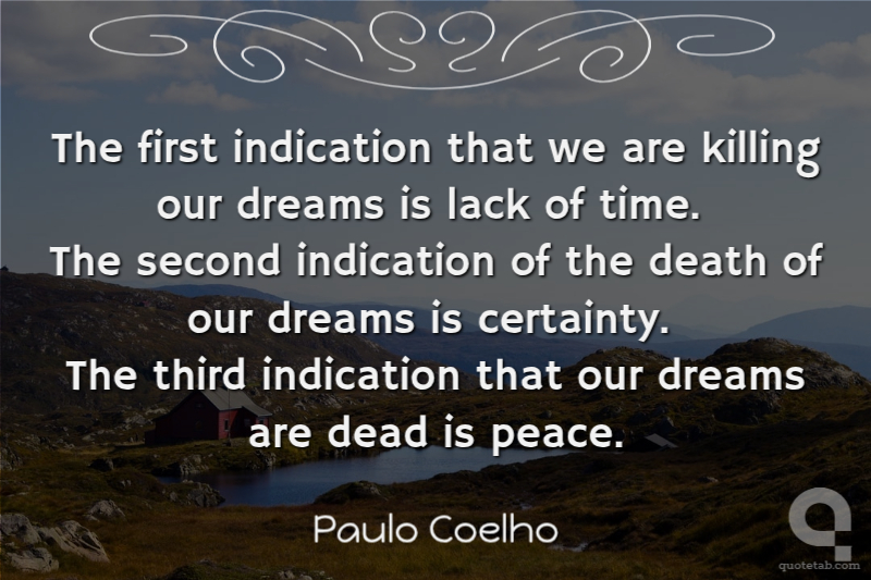 The first indication that we are killing our dreams is lack of time. The second indication of the death of our dreams is certainty. The third indication that our dreams are dead is peace.