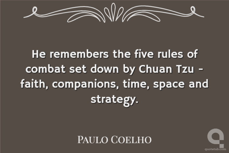 He remembers the five rules of combat set down by Chuan Tzu - faith, companions, time, space and strategy.