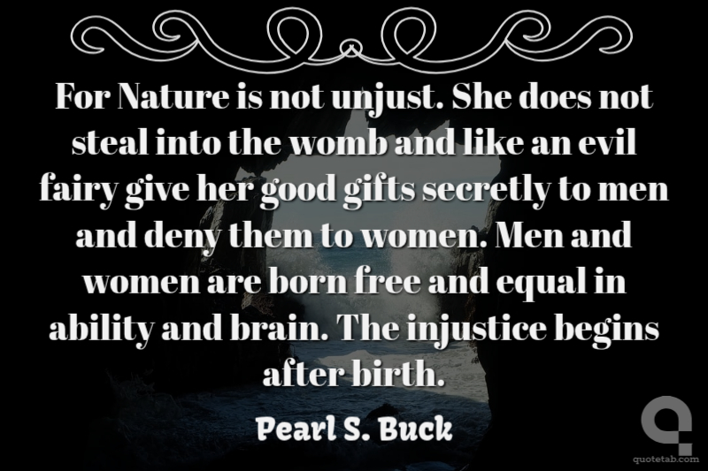 For Nature is not unjust. She does not steal into the womb and like an evil fairy give her good gifts secretly to men and deny them to women. Men and women are born free and equal in ability and brain. The injustice begins after birth.