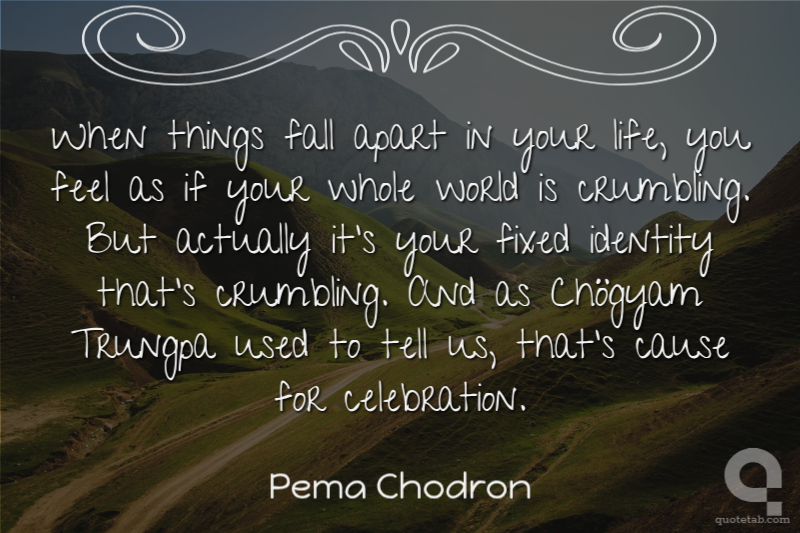 When things fall apart in your life, you feel as if your whole world is crumbling. But actually it’s your fixed identity that’s crumbling. And as Chögyam Trungpa used to tell us, that’s cause for celebration.