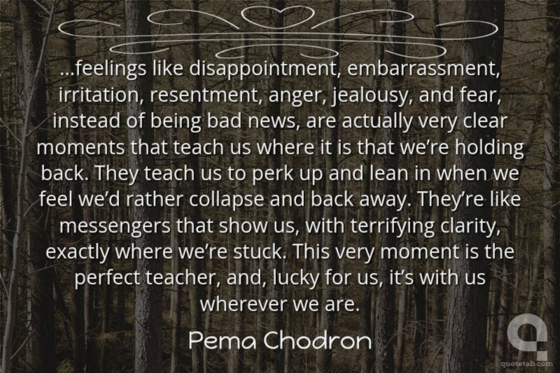 …feelings like disappointment, embarrassment, irritation, resentment, anger, jealousy, and fear, instead of being bad news, are actually very clear moments that teach us where it is that we’re holding back. They teach us to perk up and lean in when we feel we’d rather collapse and back away. They’re like messengers that show us, with terrifying clarity, exactly where we’re stuck. This very moment is the perfect teacher, and, lucky for us, it’s with us wherever we are.