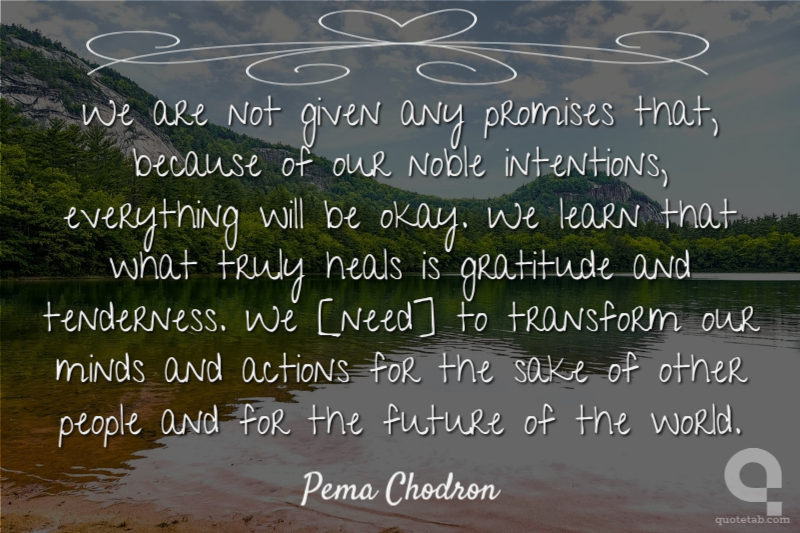 We are not given any promises that, because of our noble intentions, everything will be okay. We learn that what truly heals is gratitude and tenderness. We [need] to transform our minds and actions for the sake of other people and for the future of the world.