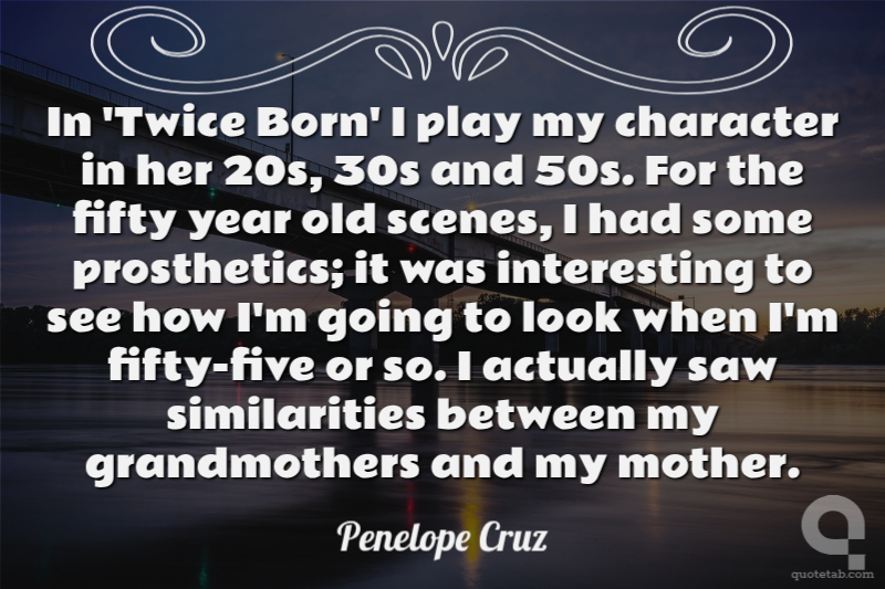 In 'Twice Born' I play my character in her 20s, 30s and 50s. For the fifty year old scenes, I had some prosthetics; it was interesting to see how I'm going to look when I'm fifty-five or so. I actually saw similarities between my grandmothers and my mother.