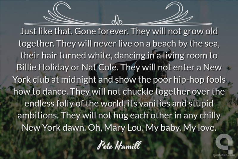 Just like that. Gone forever. They will not grow old together. They will never live on a beach by the sea, their hair turned white, dancing in a living room to Billie Holiday or Nat Cole. They will not enter a New York club at midnight and show the poor hip-hop fools how to dance. They will not chuckle together over the endless folly of the world, its vanities and stupid ambitions. They will not hug each other in any chilly New York dawn. Oh, Mary Lou. My baby. My love.