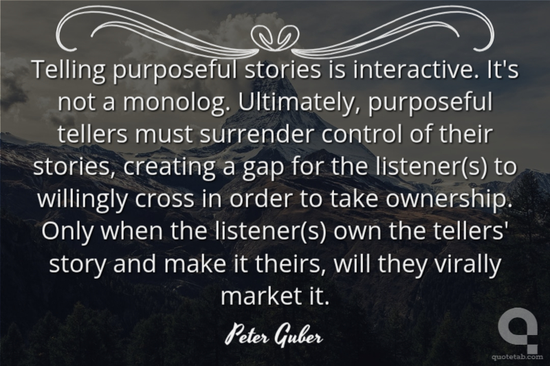 Telling purposeful stories is interactive. It's not a monolog. Ultimately, purposeful tellers must surrender control of their stories, creating a gap for the listener(s) to willingly cross in order to take ownership. Only when the listener(s) own the tellers' story and make it theirs, will they virally market it.