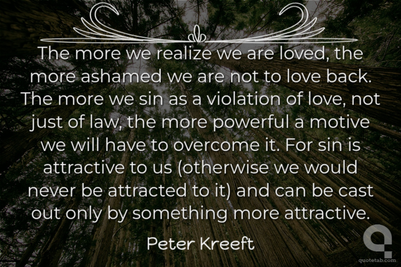 The more we realize we are loved, the more ashamed we are not to love back. The more we sin as a violation of love, not just of law, the more powerful a motive we will have to overcome it. For sin is attractive to us (otherwise we would never be attracted to it) and can be cast out only by something more attractive.