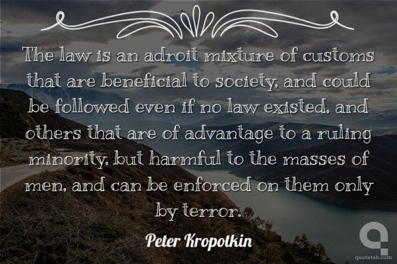 The law is an adroit mixture of customs that are beneficial to society, and could be followed even if no law existed, and others that are of advantage to a ruling minority, but harmful to the masses of men, and can be enforced on them only by terror.